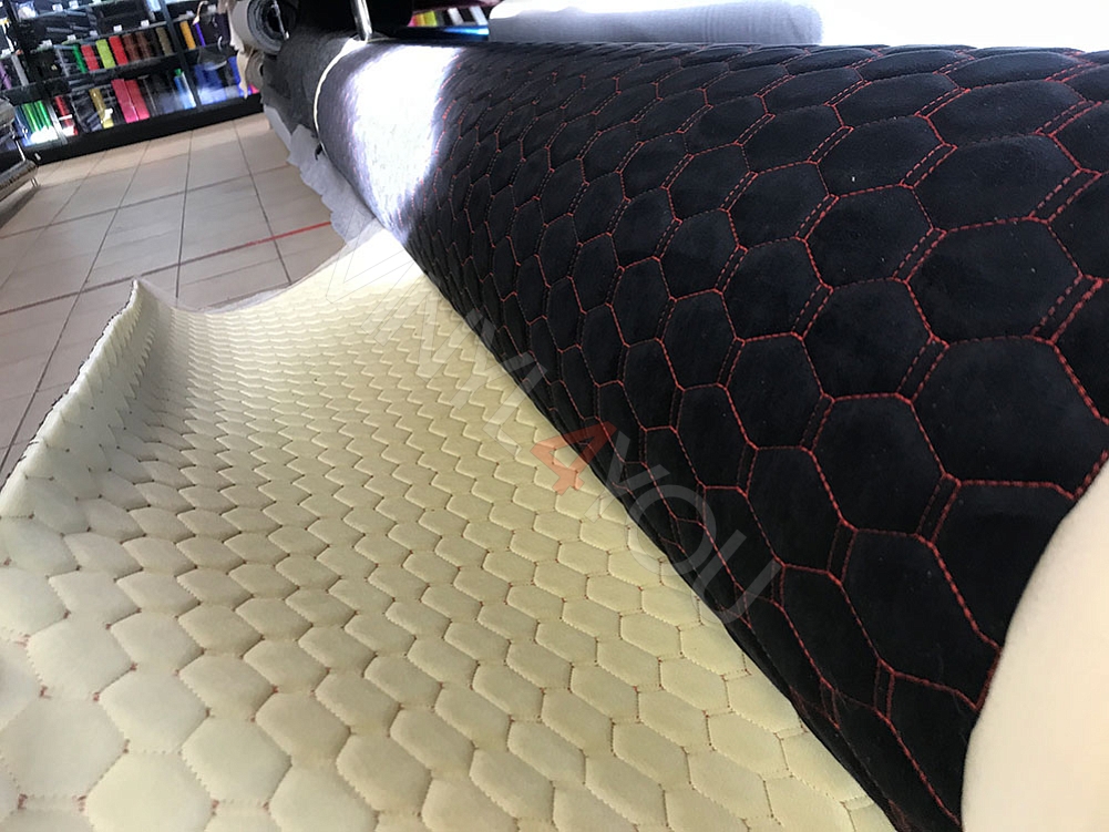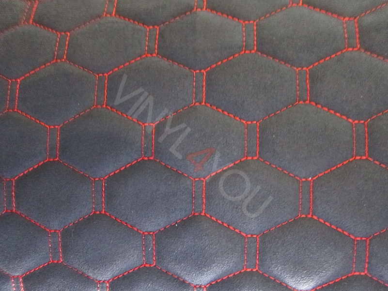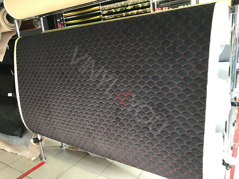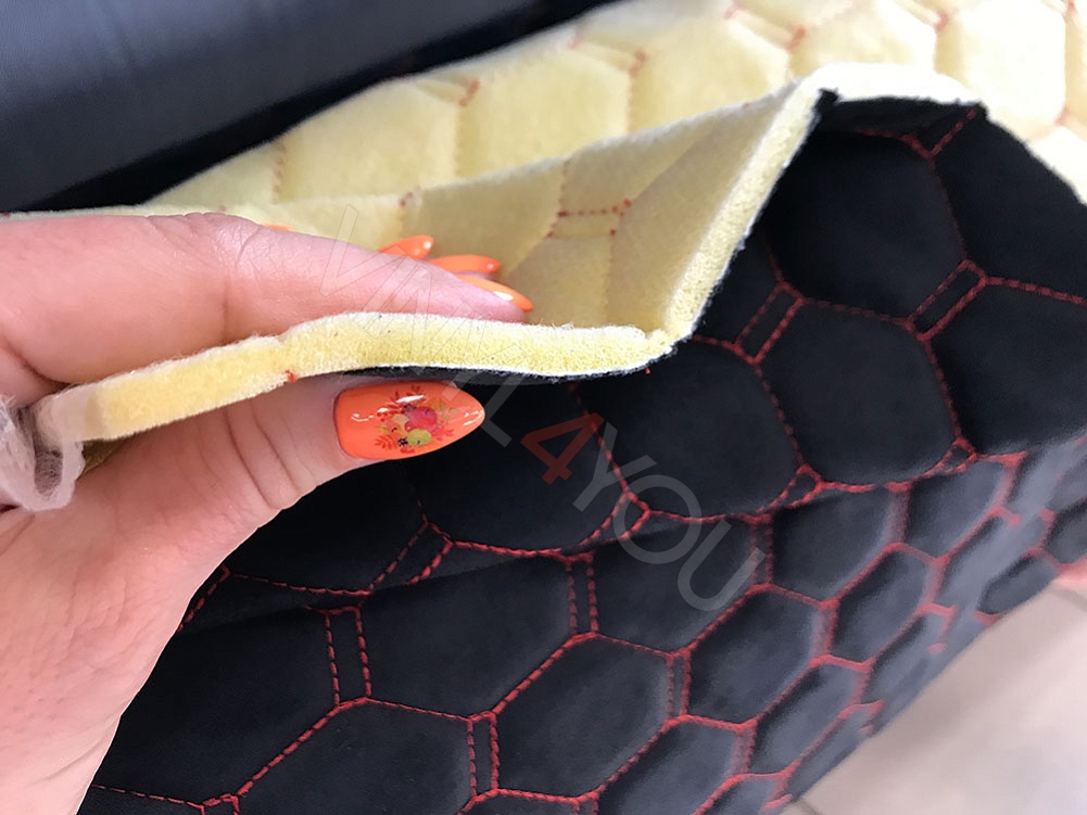 Алькантара стеганая Орегон Соты Черная с красной строчкой